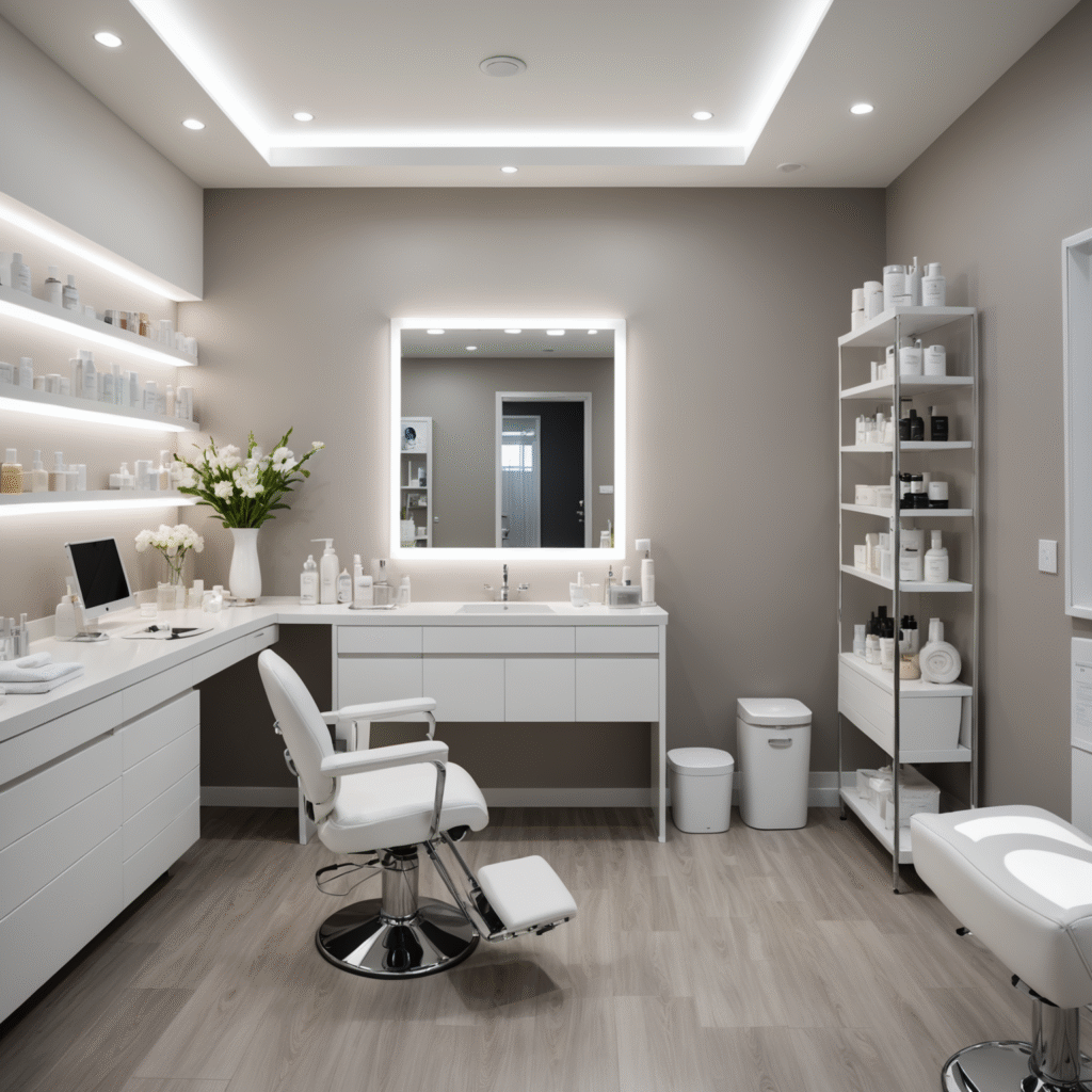 A serene cosmetic clinic treatment room with esthetician tools and skincare products