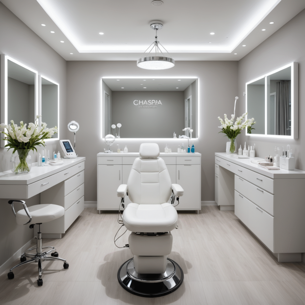 A serene cosmetic clinic treatment room with esthetician hands preparing sterile tools for a non surgical procedure.